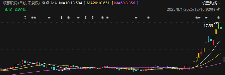 12月16日,商业航天概念分化,通宇通讯(002792)(002792.SZ)、航天电子(600879)(600879.SH)、华菱线缆(001208)(001208.SZ)等再度涨停,但大牛股顺灏股份(002565.SZ)报收于16.85元/股(不复权,下同),仅涨超3%,涨势减弱。此前12个交易日,该公司已斩获7个涨停板,累计涨幅超一倍。