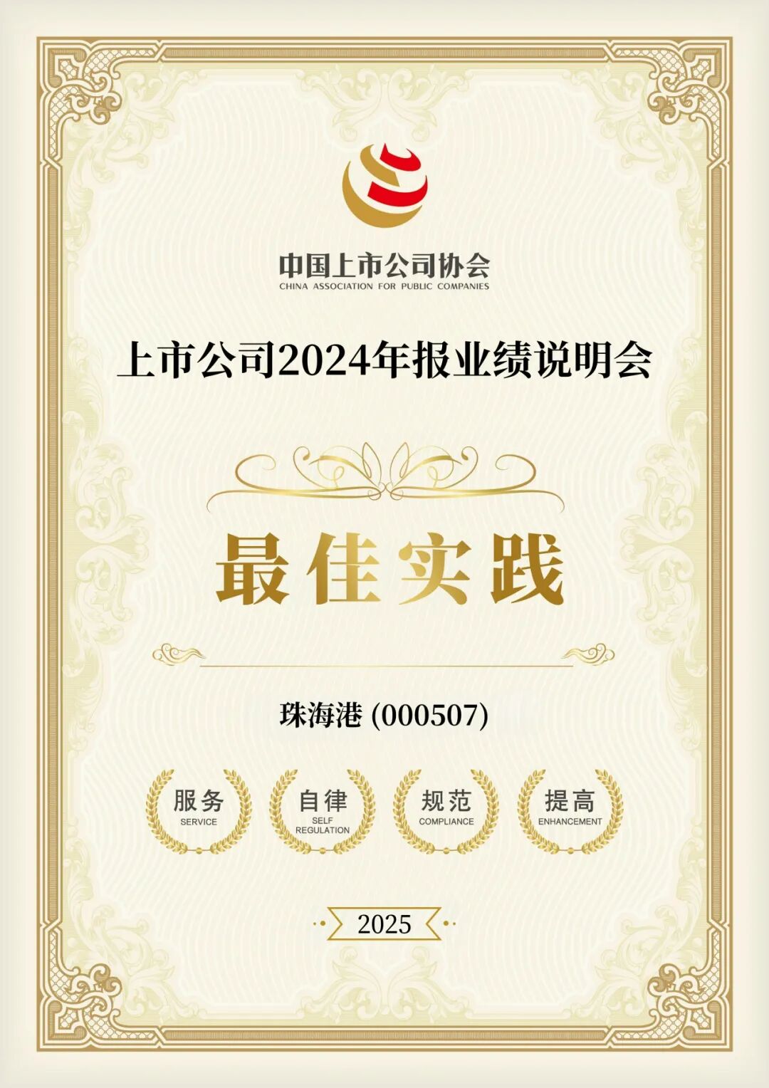 临近年末,资本市场的各大奖项评选结果陆续揭晓,珠海港(000507)股份有限公司(以下简称“公司”)在揽获中国上市公司协会“上市公司董事会秘书履职评价‘5A’评级”“上市公司董事会优秀实践案例”“上市公司董事会办公室最佳实践”及“2025年上市公司可持续发展优秀实践案例”后,于日前再获中国上市公司协会颁发的“上市公司2024年报业绩说明会最佳实践”,以及每日经济新闻主办的2025上市公司口碑榜“上市公司最具社会责任奖”。