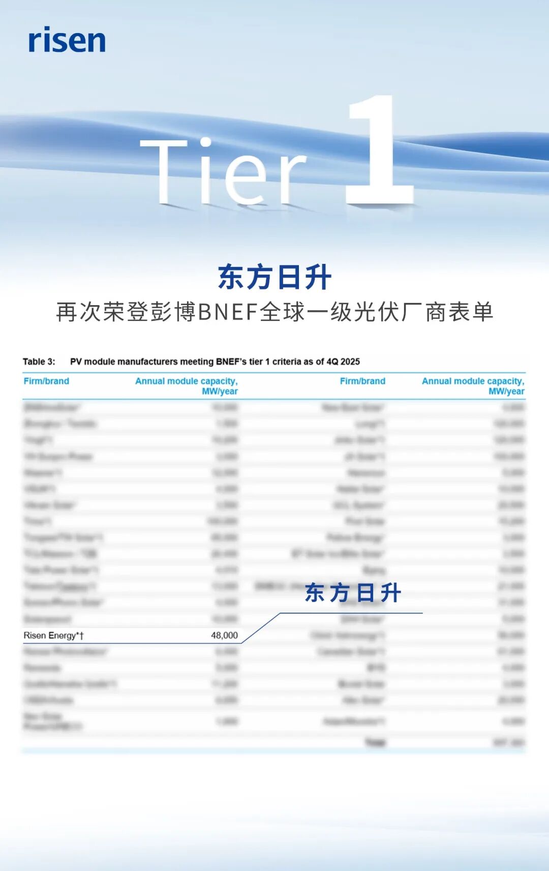 近日,彭博新能源财经(BloombergNEF)发布了2025年第四季度“全球光伏组件厂商分级”排名,东方日升(300118)新能源股份有限公司再度荣膺一级组件供应商(Tier 1),连续多期稳居全球顶级阵营。这一权威认可,再次印证公司在技术领先性、产能可靠性、全球交付能力等方面的综合实力。