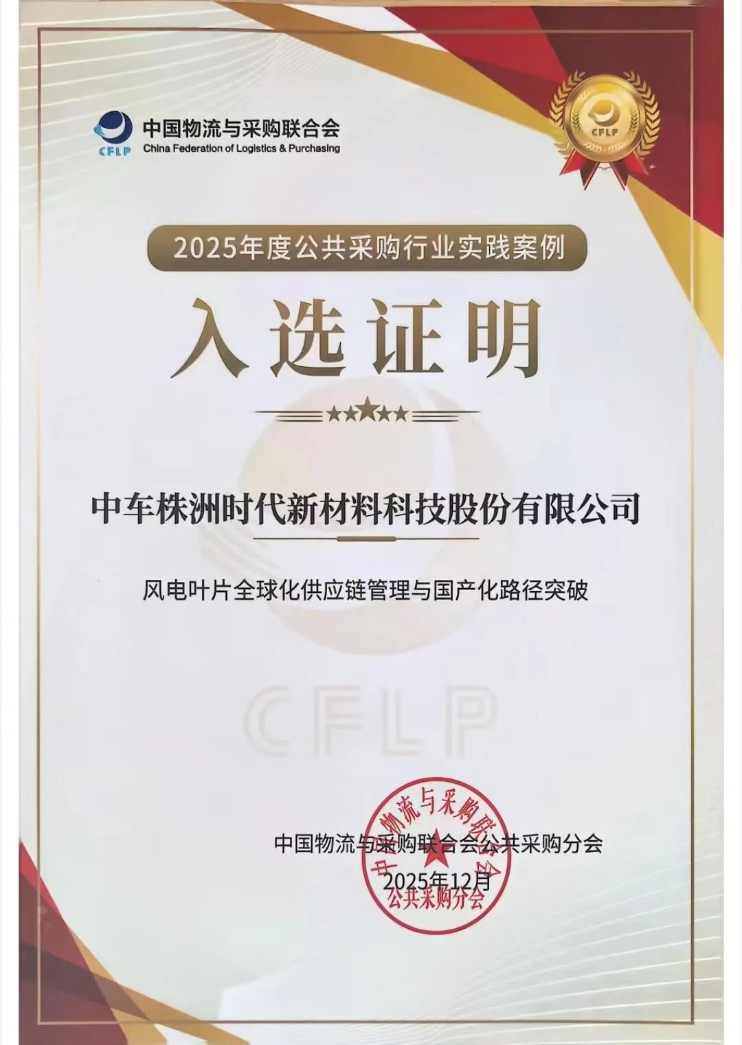 12月,在中国物流与采购联合会主办的全国公共采购案例评选中,时代新材《风电叶片全球化供应链管理与国产化路径突破》案例从众多参赛案例中脱颖而出,入选“2025年度公共采购行业实践案例”。
