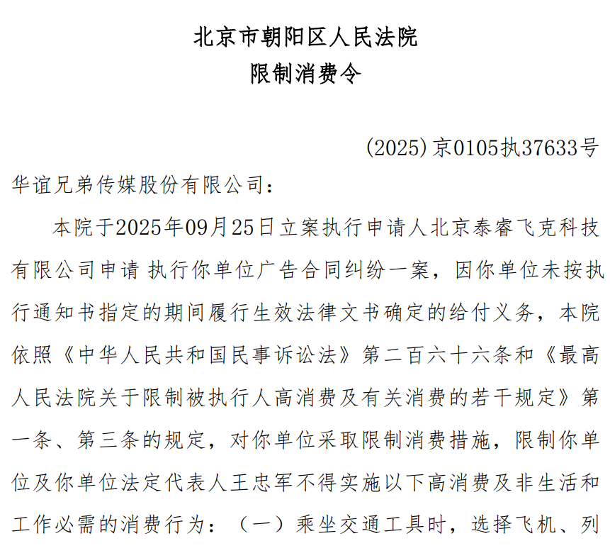 昔日影视龙头,如今正面临困境。天眼查显示,近日,华谊兄弟及其法定代表人王忠军(王中军)新增一则限制消费令,涉及广告合同纠纷案件,申请人为北京泰睿飞克科技有限公司,执行法院为北京市朝阳区人民法院。