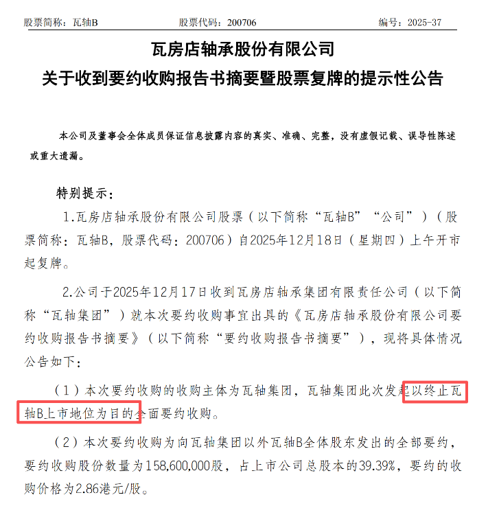 12月17日晚,瓦轴B(200706)(200706)发布公告称,公司收到控股股东瓦房店轴承集团有限责任公司(以下简称“瓦轴集团”)要约收购报告书摘要,瓦轴集团发起以终止瓦轴B上市地位为目的全面要约收购。公司股票自12月18日(星期四)上午开市起复牌。