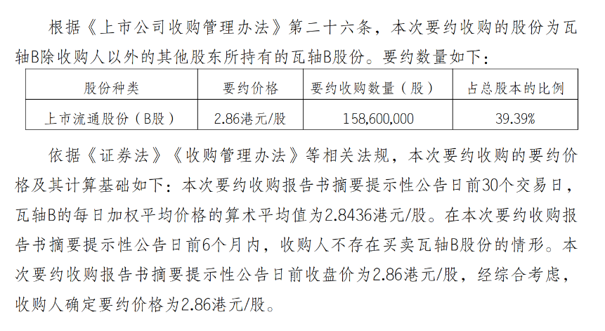 公告显示,本次要约收购为向瓦轴集团以外瓦轴B全体股东发出的全部要约,要约收购股份数量为1.586亿股,占上市公司总股本的39.39%,要约的收购价格为2.86港元/股。本次要约收购所需最高资金总额为4.53亿港元。