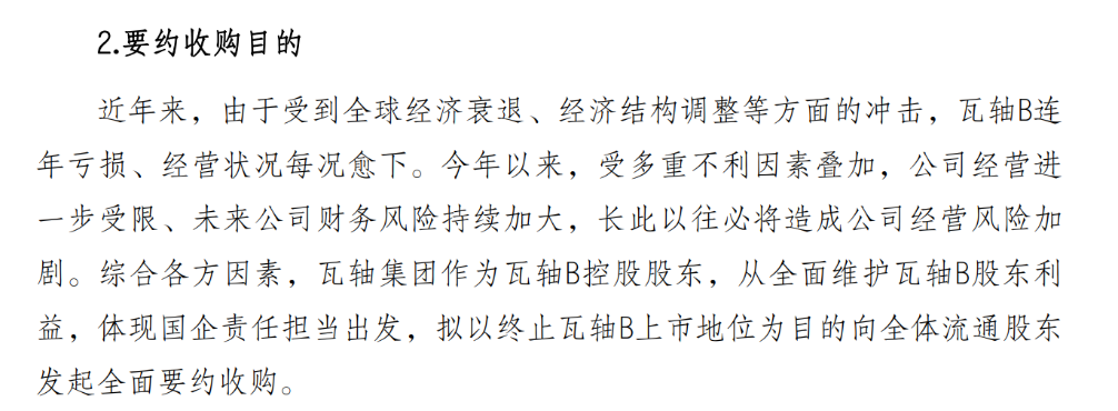 对于要约收购目的,公告显示,近年来,由于受到全球经济衰退、经济结构调整等方面的冲击,瓦轴B连年亏损、经营状况每况愈下。今年以来,受多重不利因素叠加,公司经营进一步受限、未来公司财务风险持续加大,长此以往必将造成公司经营风险加剧。综合各方因素,瓦轴集团作为瓦轴B控股股东,从全面维护瓦轴B股东利益,体现国企责任担当出发,拟以终止瓦轴B上市地位为目的向全体流通股东发起全面要约收购。