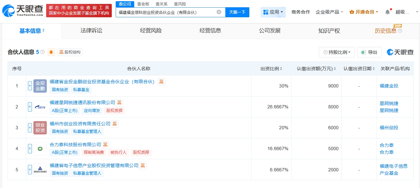 每经AI快讯,天眼查工商信息显示,近日,福建福金信科创业投资合伙企业(有限合伙)成立,执行事务合伙人为福建省电子信息产业股权投资管理有限公司,出资额3亿元人民币,经营范围包括创业投资,以私募基金从事股权投资、投资管理、资产管理等活动。合伙人信息显示,该合伙企业由福建省金投金鹏创业投资基金合伙企业(有限合伙)、星网锐捷(002396)(002396)、合力泰(002217)(002217)等共同出资。