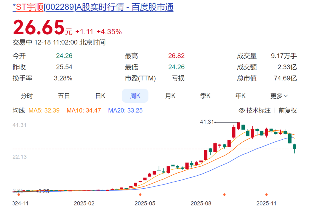 *ST宇顺是今年ST板块的十倍牛股。今年初,*ST宇顺股价只有3.56元,到了9月26日,股价最高时涨至41.31元。