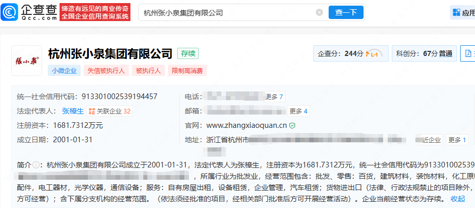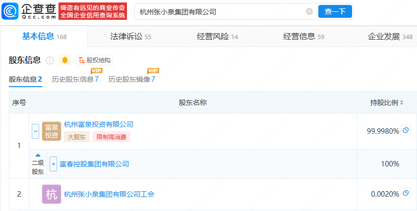 企查查APP显示,杭州张小泉集团有限公司成立于2001年1月,法定代表人为张樟生,注册资本为1681.7312万元,该公司由富春控股集团有限公司间接控股。