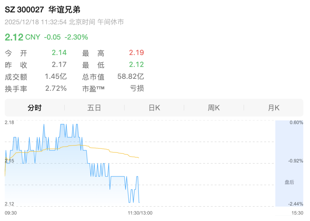二级市场上,华谊兄弟近年来股价持续走低,截至12月18日午间收盘报2.12元,总市值仅不到60亿元,不及巅峰时十分之一。