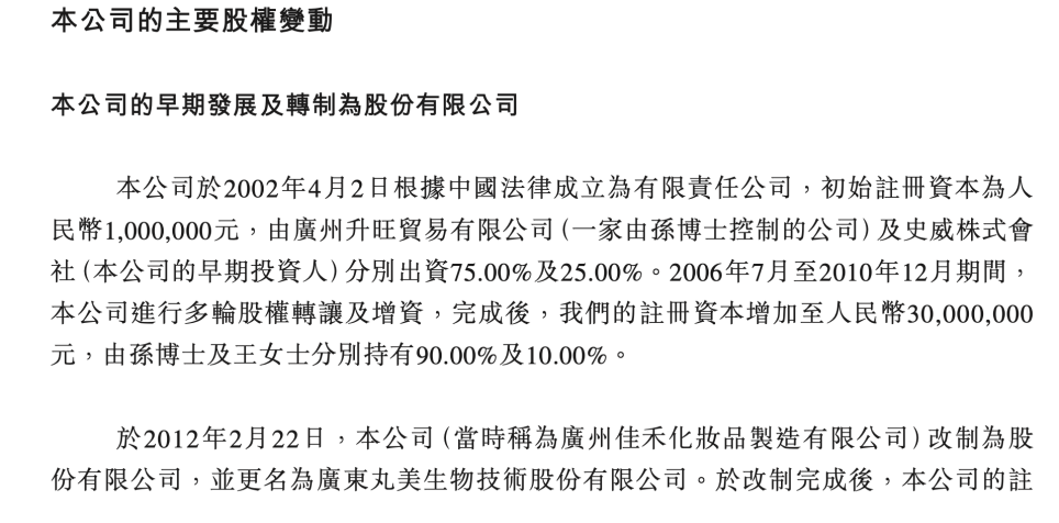 而在其后的赴港招股书中,这段历史的表述已大为简化,早期发展概括为“由广州升旺及早期投资人史威株式会社分别出资75%及25%”,后续介绍直接过渡至2010年12月股权调整后的结果,孙怀庆及妻子王晓蒲分别持股90%、10%。