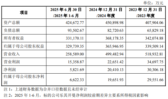 2023年度、2024年度、2025年上半年,标的公司乐其开曼营业收入分别为518,932.81万元、499,482.94万元、258,589.00万元,净利润分别为30,306.18万元、20,410.13万元、5,821.69万元,归属于母公司股东净利润分别为29,551.66万元、19,651.93万元、6,622.33万元。