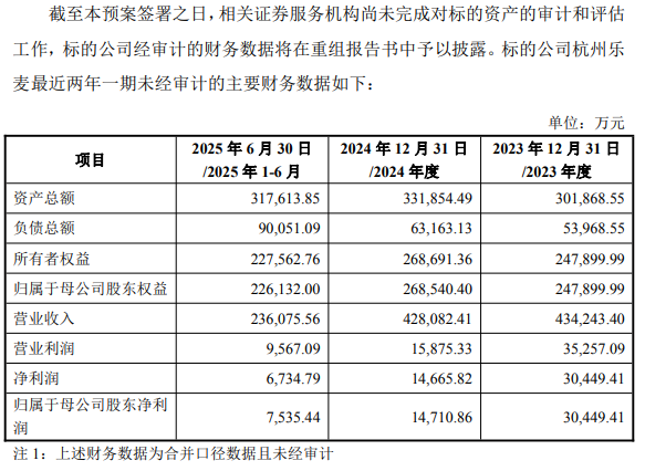 2023年度、2024年度、2025年上半年,标的公司杭州乐麦营业收入分别为434,243.40万元、428,082.41万元、236,075.56万元,净利润分别为30,449.41万元、14,665.82万元、6,734.79万元,归属于母公司股东净利润分别为30,449.41万元、14,710.86万元、7,535.44万元。