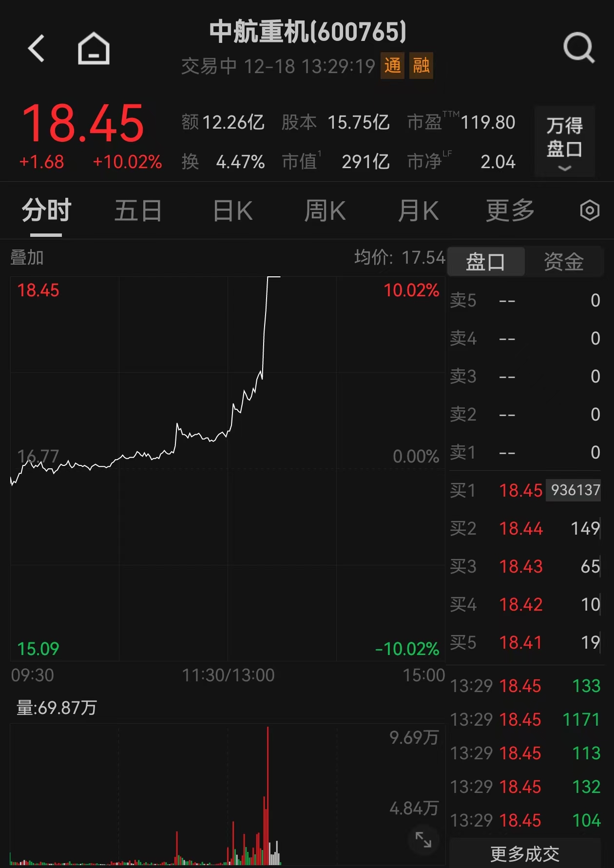 上证报中国证券网讯(记者于祥明)12月18日13点29分,中航重机(600765)异动拉升至涨停。