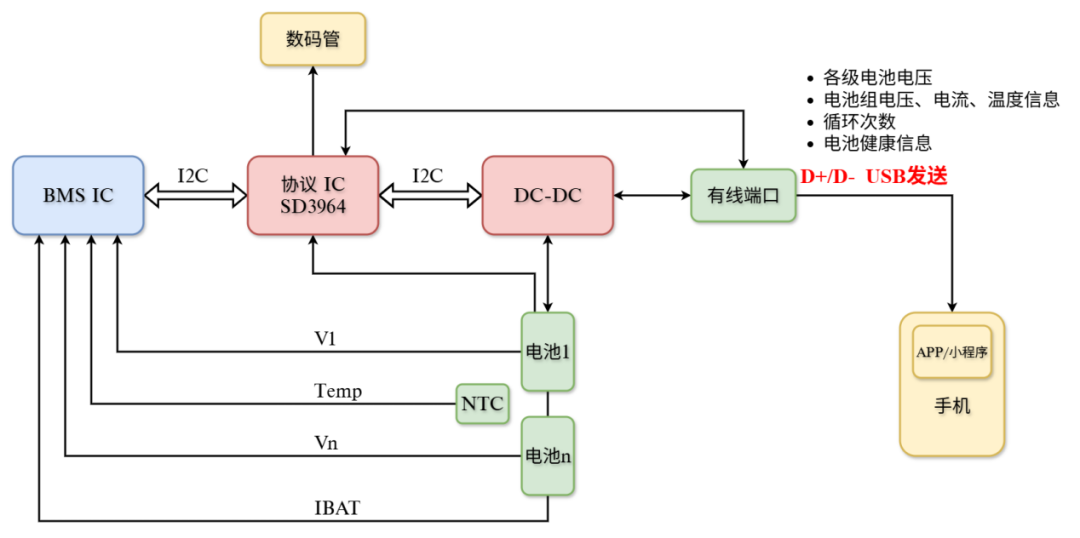 SD3964作为协议主控,通过USB协议将接收的电池核心信息整合后经D+/D-通道发送到手机端,在APP/小程序上实时显示