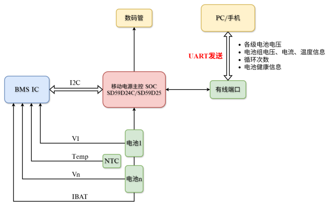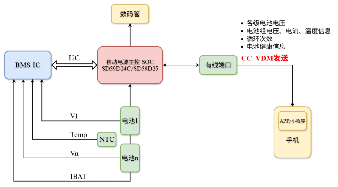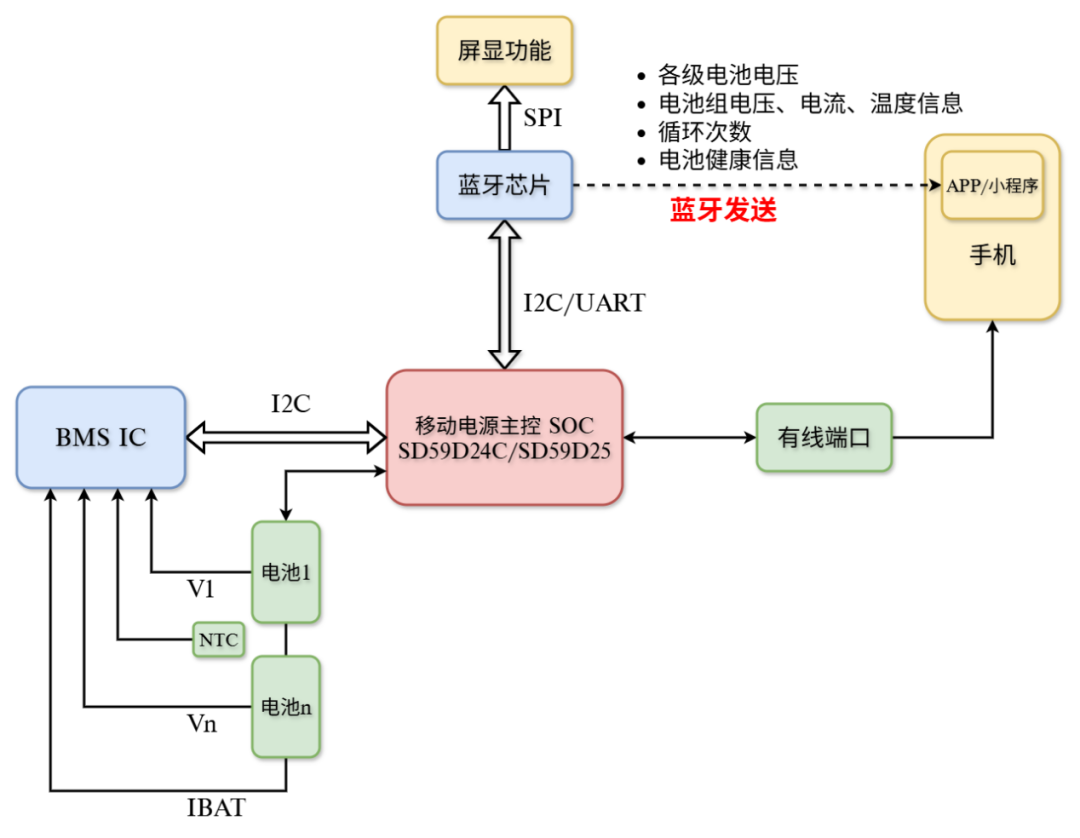 基于SD59D24C/D25移动电源SoC,搭配蓝牙芯片,构建“电池监测-系统主控-无线交互-双端可视”的完整智能体系,为高端产品提供差异化竞争力