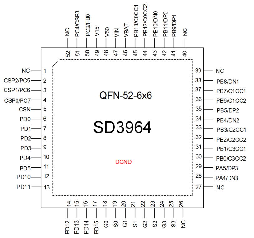 士兰微电子推出的新一代高集成多口快充移动电源协议芯片SD3964,也可向下兼容,灵活适配上文所述的USB、UART、VDM、BT四套新国标升级方案,全面覆盖终端产品市场,具有以下特点: