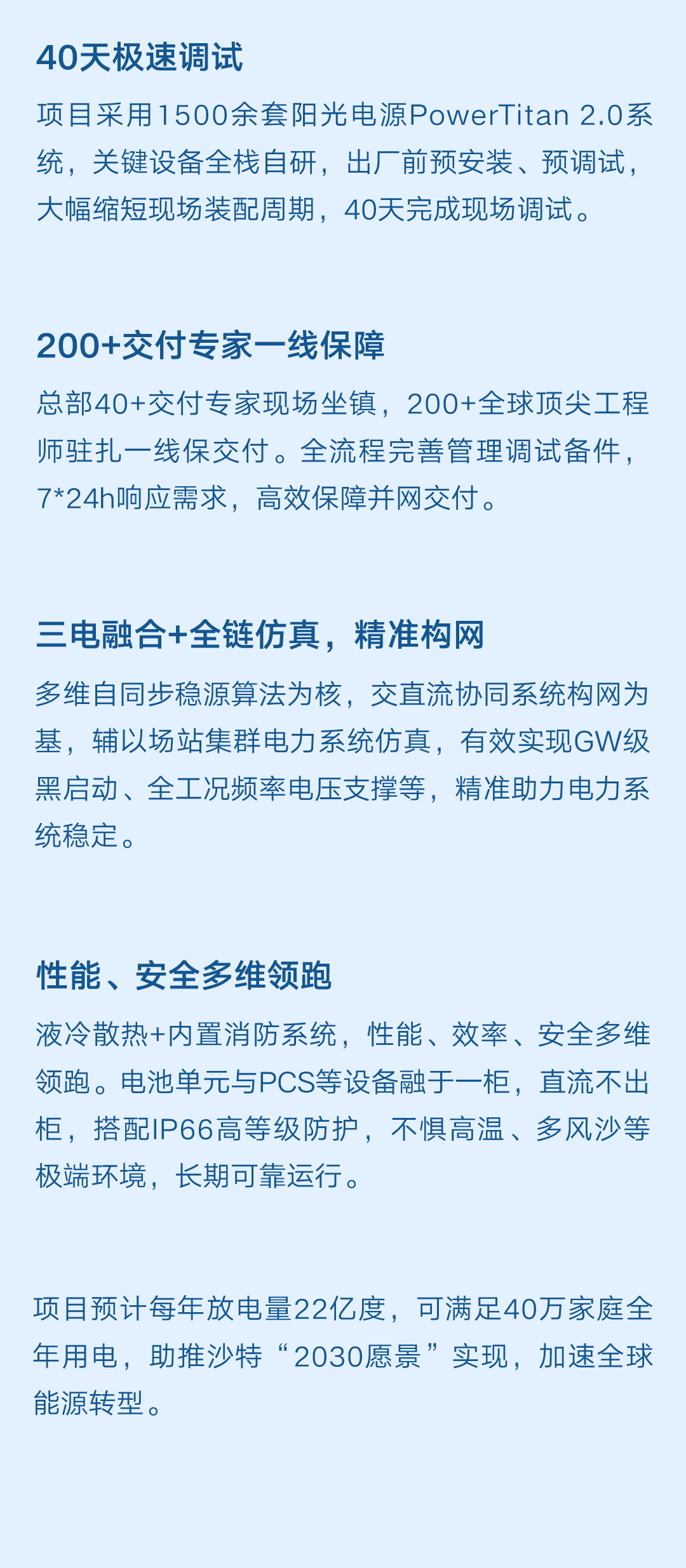 阳光电源表示,项目预计每年放电量22亿度,可满足40万家庭全年用电,助推沙特“2030愿景”实现,加速全球能源转型。