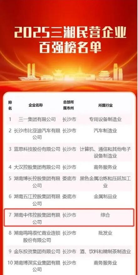 2025三湘民营企业百强榜发布,中伟集团位列第七