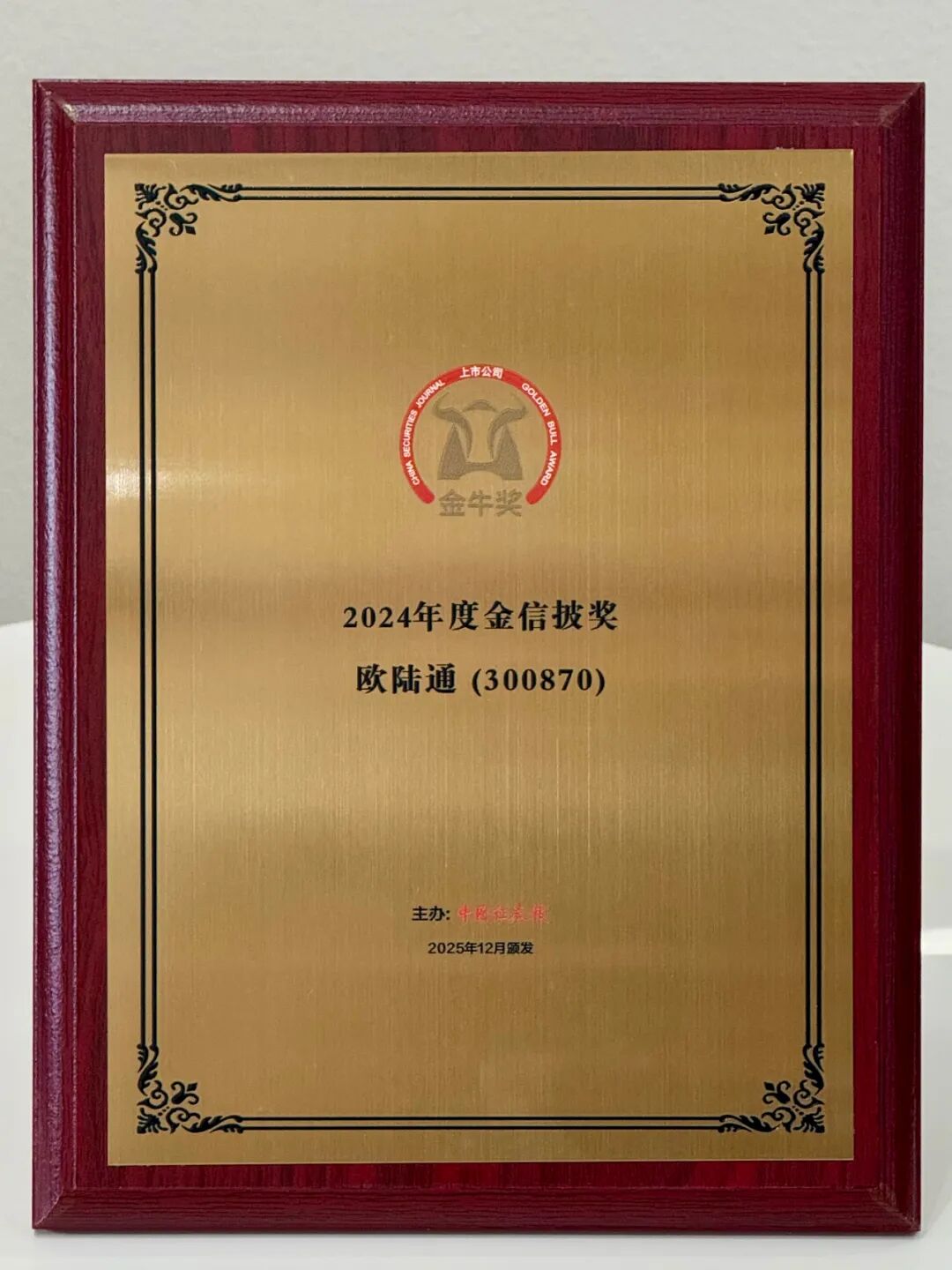 12月6日,由中国证券报主办的“2025科创投资大会”暨第二十七届上市公司金牛奖颁奖典礼在合肥盛大开幕,欧陆通凭借高质量的信息披露与规范运作,荣获“2024年度金信披奖”。