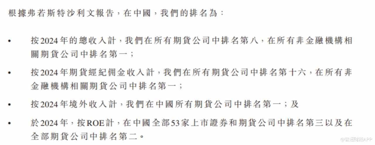 据弗若斯特沙利文报告,按2024年总收入计,南华期货在全国所有期货公司中排名第八,在非金融机构相关期货公司中高居第一;境外收入在中国所有期货公司中排名第一;ROE位列全国期货公司第二。
