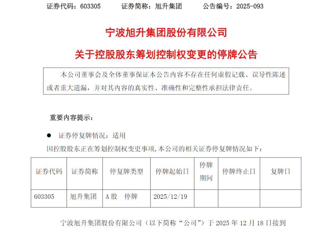 12月18日晚间,旭升集团(603305)(603305)发布公告称,接到控股股东、实控人徐旭东通知,徐旭东及其一致行动人正在筹划涉及所持有公司股份转让事宜,可能导致公司控制权变更。为避免对公司股价造成重大影响,公司股票自2025年12月19日起停牌,预计停牌时间不超过2个交易日。