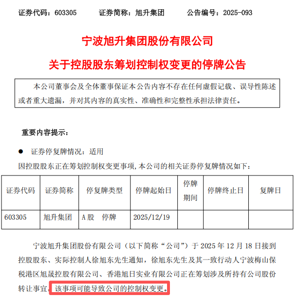 【导读】旭升集团(603305)控股股东又筹划控制权变更事项,自12月19日开市起停牌