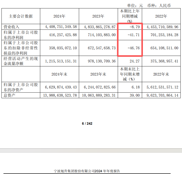 2022年至2024年,旭升集团的营业收入分别为44.54亿元、48.34亿元、44.09亿元,归母净利润分别为7.01亿元、7.14亿元、4.16亿元。