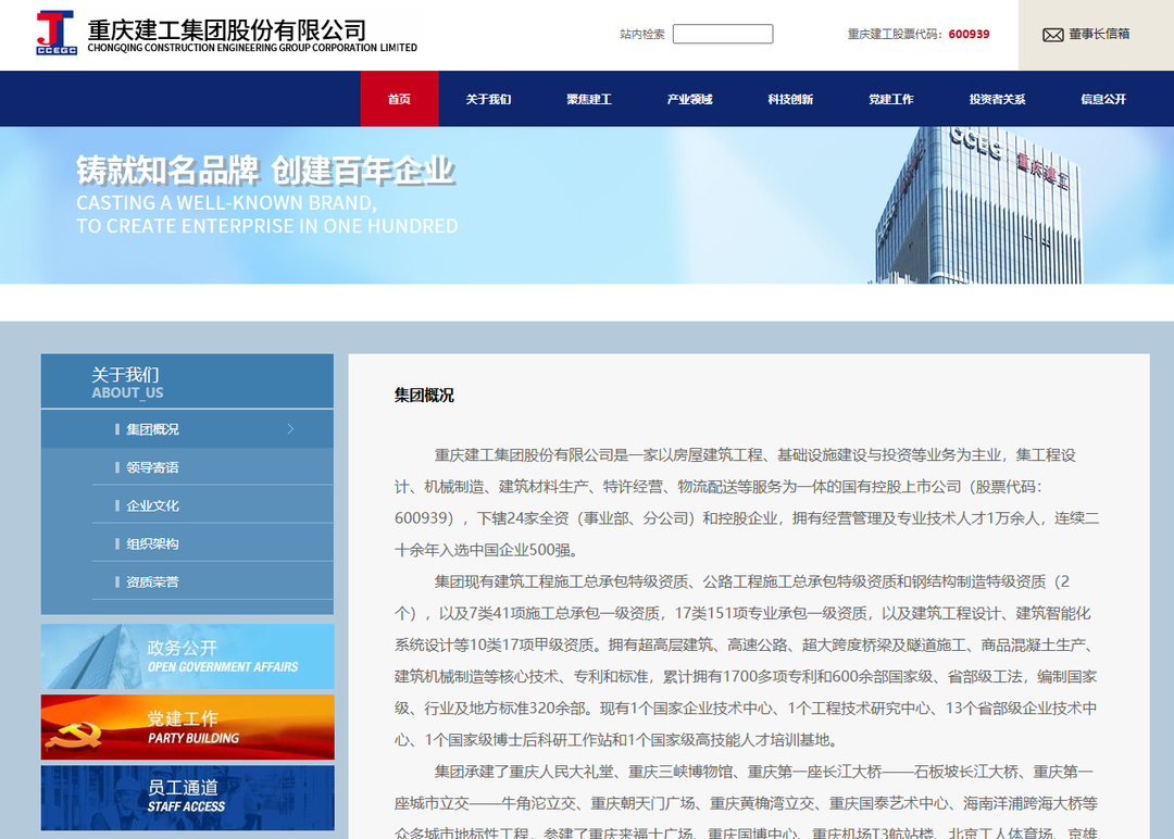 重庆建工集团股份有限公司是一家以房屋建筑工程、基础设施建设与投资等业务为主业,集工程设计、机械制造、建筑材料生产、特许经营、物流配送等服务为一体的国有控股上市公司(股票代码:600939),下辖24家全资(事业部、分公司)和控股企业,拥有经营管理及专业技术人才1万余人,连续二十余年入选中国企业500强。