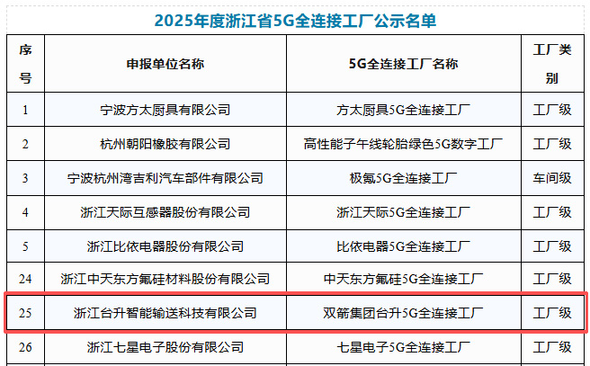 近日,浙江省经济和信息化厅正式公示2025年度“浙江省5G全连接工厂”拟入选名单。浙江双箭橡胶股份有限公司全资子公司——浙江台升智能输送科技有限公司(以下简称“台升智能”)凭借其在智能制造与数字化转型方面的卓越表现,成功入选。值得注意的是,台升智能是本批次中橡胶输送带领域唯一入选的企业,标志着其在5G融合应用与未来工厂建设方面已走在全省乃至全国行业前列。