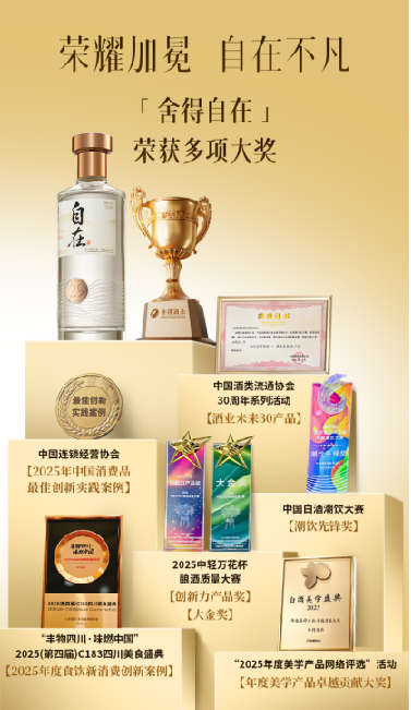市场与行业也对舍得自在给予高度认可。11月20日,产品获中国轻工业联合会颁发的“2025中轻万花杯酿酒质量大赛大金奖”与“创新力产品奖”,彰显其卓越酒体品质。此前,在由糖酒快讯联合多家机构共同发起的“2025年度美学产品网络评选”中,舍得自在摘得“2025年度美学产品卓越贡献大奖”,体现了其在酒体品质、包装设计和文化表达上的全方位美学升级,为白酒行业发展注入了新活力与想象空间。