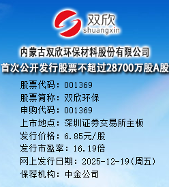 中国上市公司网讯12月19日,内蒙古双欣环保(001369)材料股份有限公司(以下简称“双欣环保”或公司)申购。公司的股票简称为“双欣环保”,股票代码为“001369”,该代码同时适用于本次发行的初步询价、网下申购及网上申购。双欣环保本次发行价格为6.85元/股,发行市盈率为16.19倍。