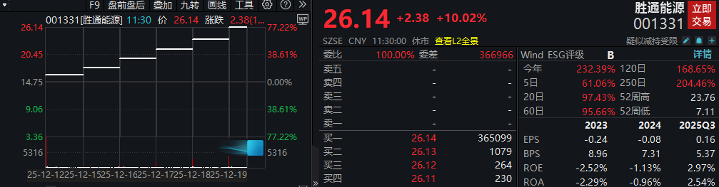 19日,本周“连板大牛股”胜通能源(001331)股价延续开盘即涨停的走势,收获第六个“一字”涨停。连续涨停期间,其累计涨幅达到77.22%,总市值自42亿元攀升至74亿元。