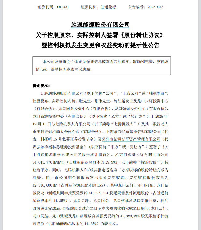 在停牌5个交易日后,胜通能源于12月11日晚间发布公告称,重庆特种机器人企业七腾机器人有限公司(下称“七腾机器人”)及其一致行动人,拟通过“协议受让+部分要约收购”方式,合计斥资超16亿元持有胜通能源最多44.99%的股份。交易完成后,公司控股股东将变更为七腾机器人,实控人将变更为朱冬。