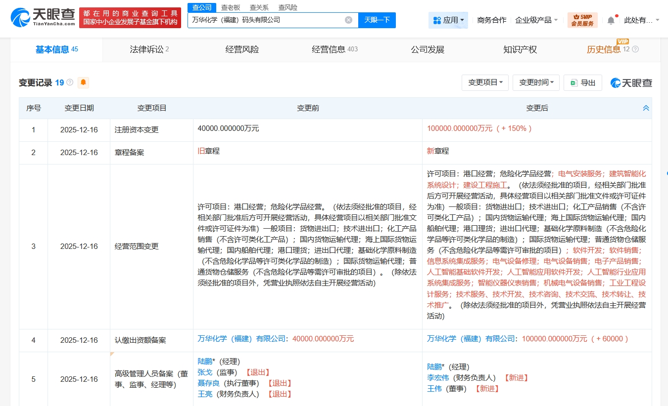 每经AI快讯,天眼查App显示,近日,万华化学(600309)(福建)码头有限公司发生工商变更,注册资本由4亿元人民币增至10亿元人民币,同时,部分高管也发生变更。该公司成立于2020年7月,法定代表人为陆鹏,经营范围含港口经营、危险化学品经营、电气安装服务、建筑智能化系统设计、货物进出口、国内货物运输代理、进出口代理、基础化学原料制造、人工智能基础软件开发等,由万华化学旗下万华化学(福建)有限公司全资持股。