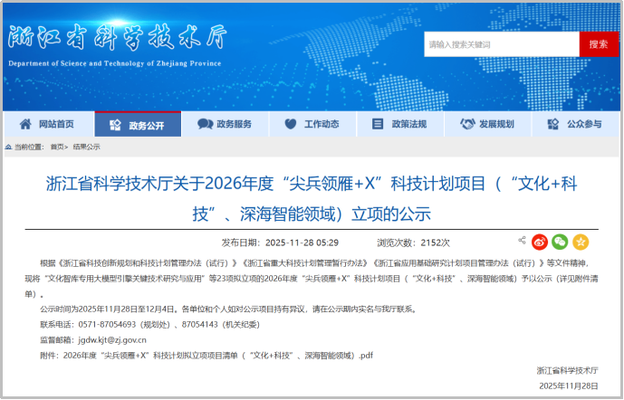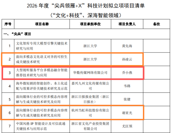 近日,浙江省科技厅发布了2026年度“尖兵领雁+X”科技计划拟立项项目清单(“文化+科技”、深海智能领域)。其中由华数传媒(000156)网络有限公司首次牵头承担的“大型视听服务平台多模态融合智能推荐技术研究与应用”成功入选“尖兵”项目清单。同时,华数作为重要参与单位的2个“尖兵”项目也成功入选,分别是“面向多模态文化语义对齐的可控生成关键技术研究”和“面向媒体行业的可控多模态内容理解与生成关键技术研究及应用”。