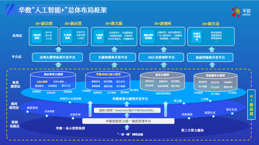 华数此次成功牵头和参与以上多项“尖兵”项目,其核心基础在于前瞻性地在“人工智能+”与“视听+文旅”领域进行了战略布局、技术攻关与实践积累。近年来,华数始终坚持“文化+科技”的融合发展路径,将实施“人工智能+”战略作为驱动企业转型升级的关键抓手,全面推进数智化发展,取得了系列标志性成果。