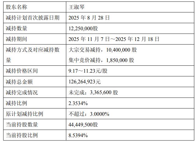 公司于2025年12月18日收到股东王淑琴发来的《关于减持股份计划实施结果的告知函》,获悉王淑琴于2025年11月7日至2025年12月18日期间通过上海证券交易所集中竞价交易方式、大宗交易方式减持公司股份合计12,250,000股,占公司总股本的2.3534%。其中,通过集中竞价交易方式减持公司股份1,850,000股,占公司总股本的0.3554%;通过大宗交易方式减持公司股份10,400,000股,占公司总股本的1.9980%。截至公告披露日,王淑琴本次减持计划时间已届满。