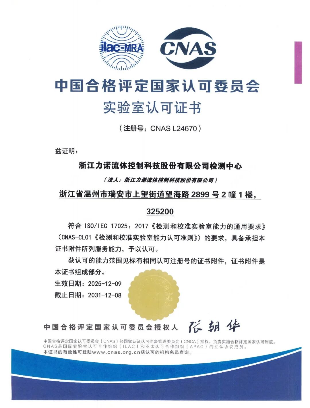 2025年10月18日至12月9日,浙江力诺(300838)流体控制科技股份有限公司检测中心接受了中国合格评定国家认可委员会(CNAS)的严格评审,并顺利通过,成功获得CNAS实验室认可证书。此举标志着公司正式跻身国家级认可实验室行列,其阀门检测领域的技术能力与质量管理水平获得了国家权威认可。