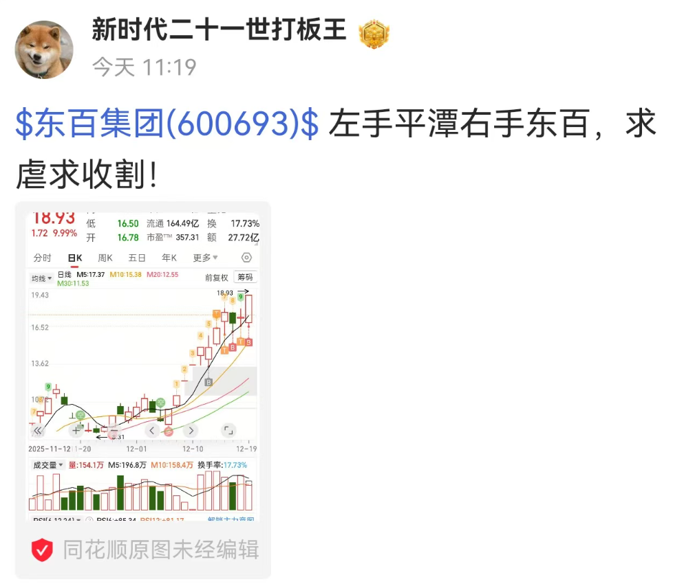 值得玩味的是,同花顺(300033)社区有认证投资者“新时代二十一世打板王”在11时19分晒图,并配文“左手平潭右手东百,求虐求收割!”,收盘可谓是“求锤得锤”了,收盘后该投资者发文称其“一股没卖”。