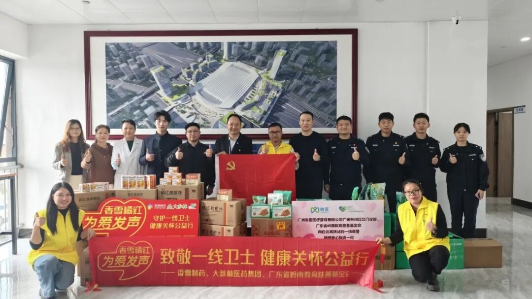 现场,香雪制药党委书记朱学艺与岭南基金会党支部书记黄义共同将橘红爱心物资移交给广州白云站乘警支队、广州白云站派出所,每一份都贴合乘警、民警日常工作与健康需求。