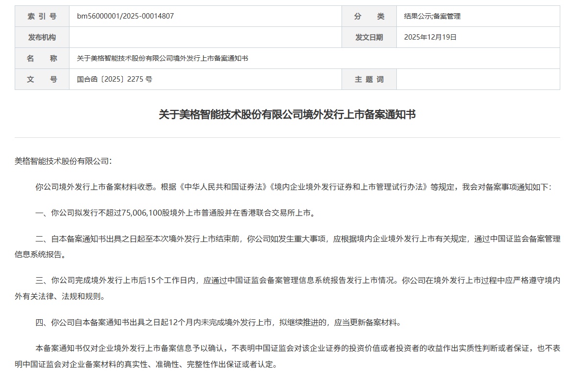 12月19日,中国证监会国际合作司发布《关于美格智能(002881)技术股份有限公司境外发行上市备案通知书》。美格智能(002881.SZ)拟发行不超过75,006,100股境外上市普通股并在香港联合交易所上市。