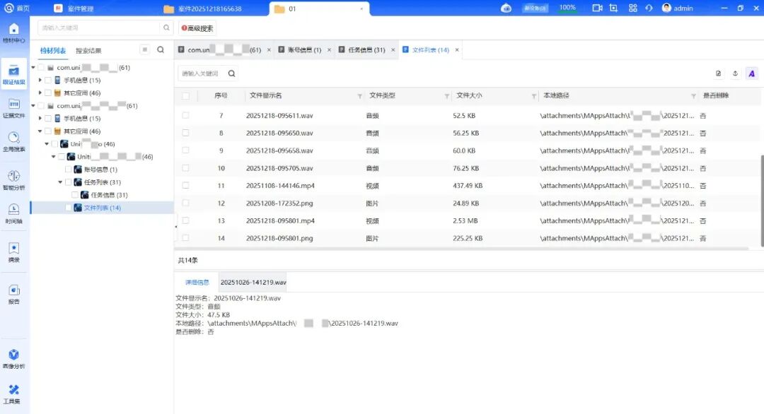 任务信息中保存有各类动作信息,如语音交互,屏幕交互等。通过语音指令内容和语音文件(如“拍摄书房文件”“进入某围墙内”)还原操控意图,结合声纹识别技术辅助确认操控者身份,与多媒体数据形成行为闭环。