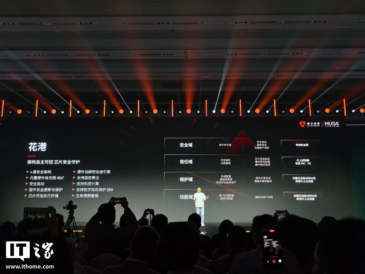 据摩尔线程官方介绍,花港配备4层安全架构,通过安全域、信任域、保护域、功能域四个层级,实现不同维度的安全管理与功能承载。同时,花港搭载硬件加解密加速引擎,支持国密算法、密计算、数字版权保护DRM及生命周期管理等能力。