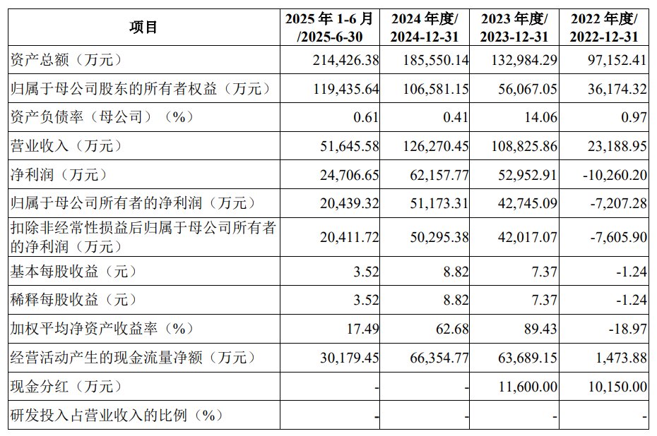 财务方面,于2022年度、2023年度、2024年度、2025年1-6月,公司分别实现营业收入2.32亿元、10.88亿元、12.63亿元和5.17亿元;同期,分别录得净利润-1.02亿元、5.30亿元、6.22亿元和2.47亿元。整体来看,报告期内公司业绩呈现稳定增长趋势。