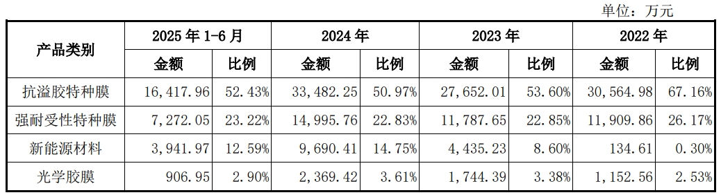 招股书披露,新广益是一家专注于高性能特种功能材料研发、生产及销售的高新技术企业,主要产品有抗溢胶特种膜、强耐受性特种膜等特种功能材料。抗溢胶特种膜是一种用于柔性线路板生产过程中的重要制程材料。