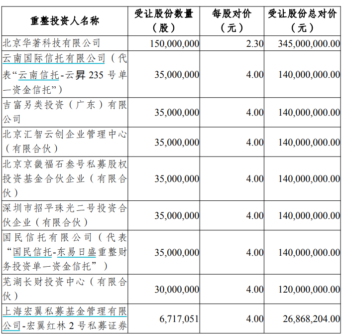 重整投资人包括北京华著科技有限公司、云南国际信托等,将提供投资款14.12亿元。产业投资人北京华著科技有限公司承诺在取得股份之日起36个月内不转让,财务投资人承诺12个月内不转让。