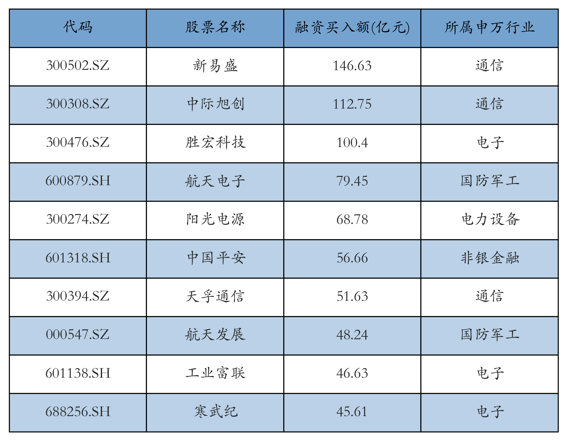 上周两市共有3469只个股有融资资金买入,共有149只个股买入金额超10亿元,其中新易盛(300502)、中际旭创(300308)、胜宏科技(300476)排名前三,买入金额分别146.63亿元、112.75亿元、100.4亿元。融资买入额前10个股详情见下表: