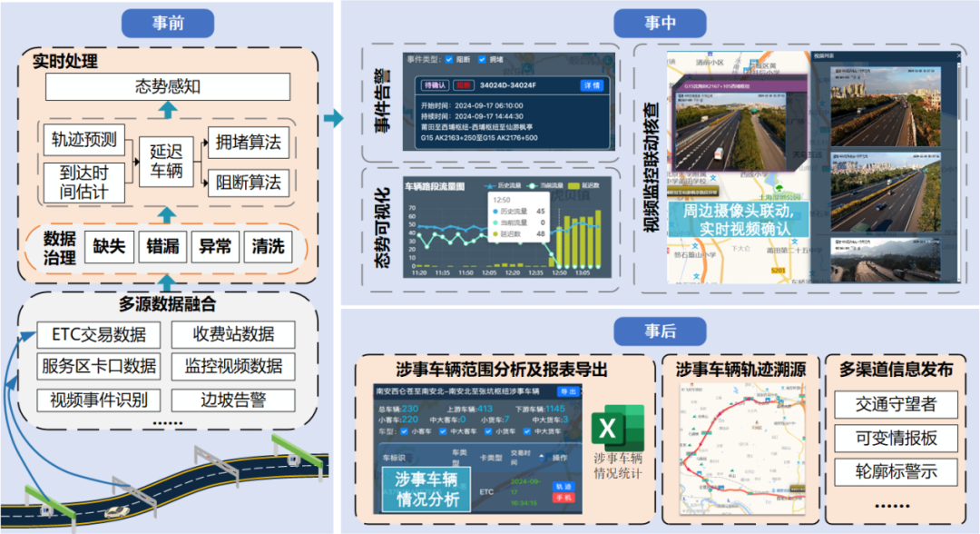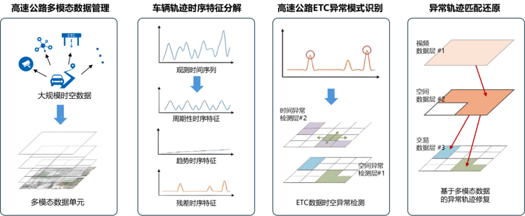 项目创新研发 “基于掩码自监督的高速公路多模态大数据融合治理技术”,高效整合ETC门架、收费站、视频监控等多源异构数据,构建起路基-车基协同感知的“一张图”管理模式。该技术实现百亿级轨迹数据秒级处理,异常数据修复率、噪声去除率均超98%,为高速公路全网收费管理、交通态势精准分析提供了高质量、高可靠的数据保障,筑牢了智慧交通发展的 “数据底座”。