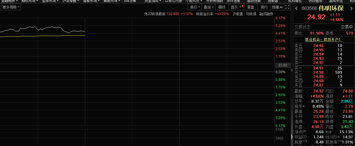 12月22日,伟明环保(603568)股价大涨。截至发稿,股价涨幅近5%,成交额超2亿元。