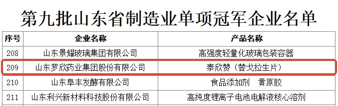 罗欣药业荣获“山东省制造业单项冠军企业”