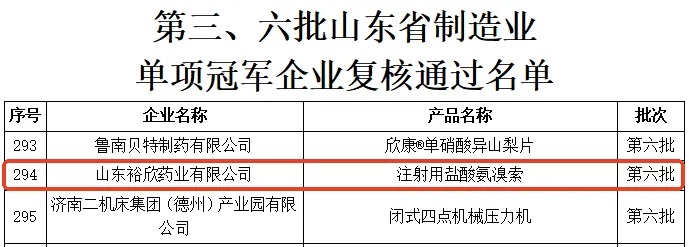 近日,山东省工业和信息化厅发布了《关于公布第九批山东省制造业单项冠军企业和通过复核的第三、六批制造业单项冠军企业名单的通知》,罗欣药业(002793)集团股份有限公司(以下简称“罗欣药业”)下属子公司山东罗欣药业集团股份有限公司成功入选第九批认定名单,子公司山东裕欣药业有限公司顺利通过第六批复核。